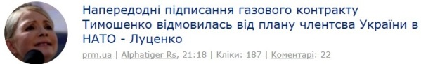 Хотя, конечно, нужно отдать должное креативу порохоботов, которые проявляют просто чудества креатива в своих заголовках. Если честно, то вчера сам не удержался, чтобы не пройти по ссылке под заголовком «Напередодні підписання газового контракту Тимошенко відмовилась від плану членства України в НАТО – Луценко».
