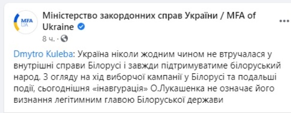 И тем показательнее невыразительная реакция официального Киева в духе «ни два, ни полтора» в отношении очевидных преступлений колхозного диктатора. Это я о позиции Министерства иностранных дел Украины, которое на своей фейсбук-странице разместило твит Дмитрия Кулебы, которого нет даже в его фейсбук-ленте.