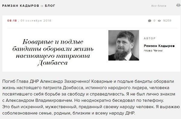 А начну я с пафосно-гневного поста Рамзана Кадырова о «коварных и подлых бандитах, оборвавших жизнь настоящего патриота Донбасса».