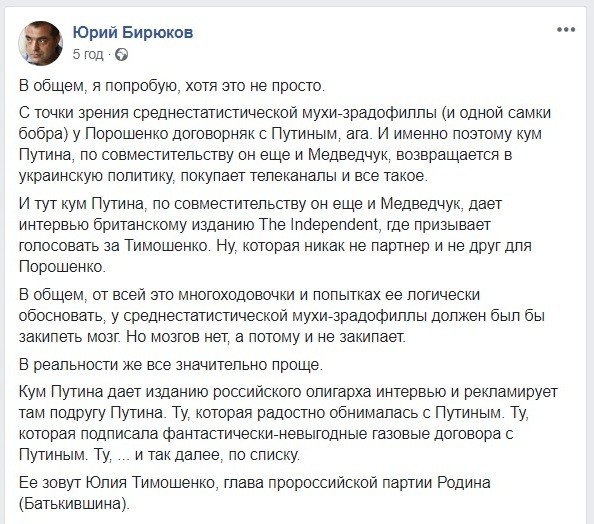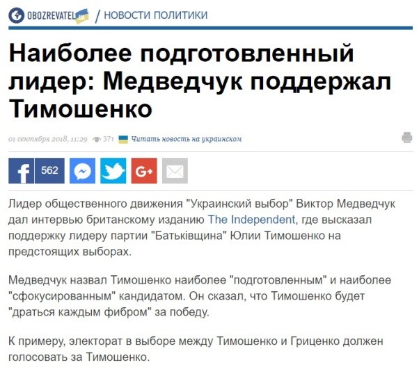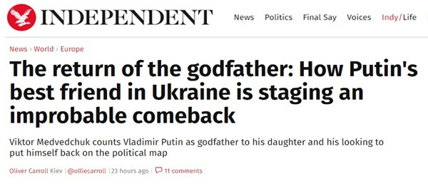 Самое интересное здесь другое! В этой же самой статье в The Independent, о которой идет речь на «Обозе», Медведчук хвалит Порошенко так, шо Юля нервно курит в сторонке.