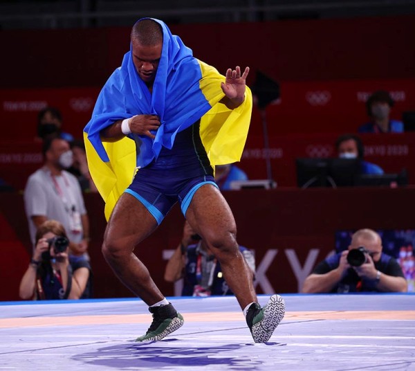 Tokyo 2020 Olympics — Wrestling — Greco-Roman — Men’s 87kg — Gold medal match — Makuhari Messe Hall A, Chiba, Japan — August 4, 2021. Zhan Beleniuk of Ukraine celebrates after winning gold REUTERS/Leah Millis