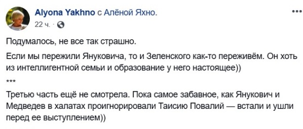 Ну а по поводу ее «протывсихства» — то не ее нужно об этом спрашивать, а ее шефа. Как он решит — быть протывсихом, не быть протывсихом, поддерживать кого-то на выборах — такой позиции она и будет придерживаться в ближайшие 3 месяца. За минувший год Лиза уже несколько раз меняла свою позицию в своих блогах — то она протывсих, то вроде как уже и нет, поддерживает Вакарчука, Гриценко, сейчас вот — Зеленского.