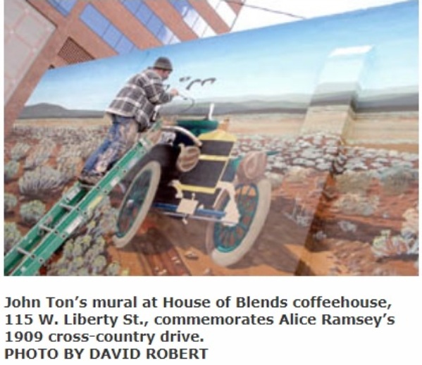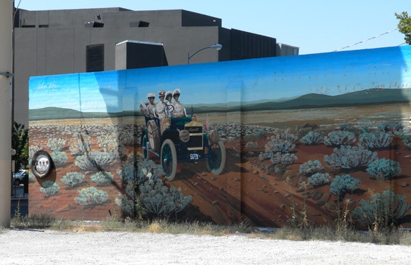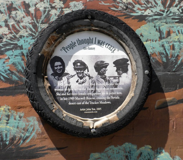 А это мурал «Alice Ramsey» на углу улиц Сьерра и Либерти в городе Рино, который находится на западе штата Невада, США. Размер мурала 50 на 12 футов, художник John Ton, 2004 год.